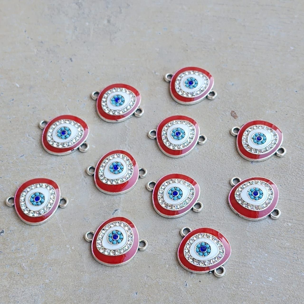 CONECTOR OJO TURCO CHATO CON STRASS ROJO SILVER x 12 UNIDADES (20mm x 17 mm APROX.).