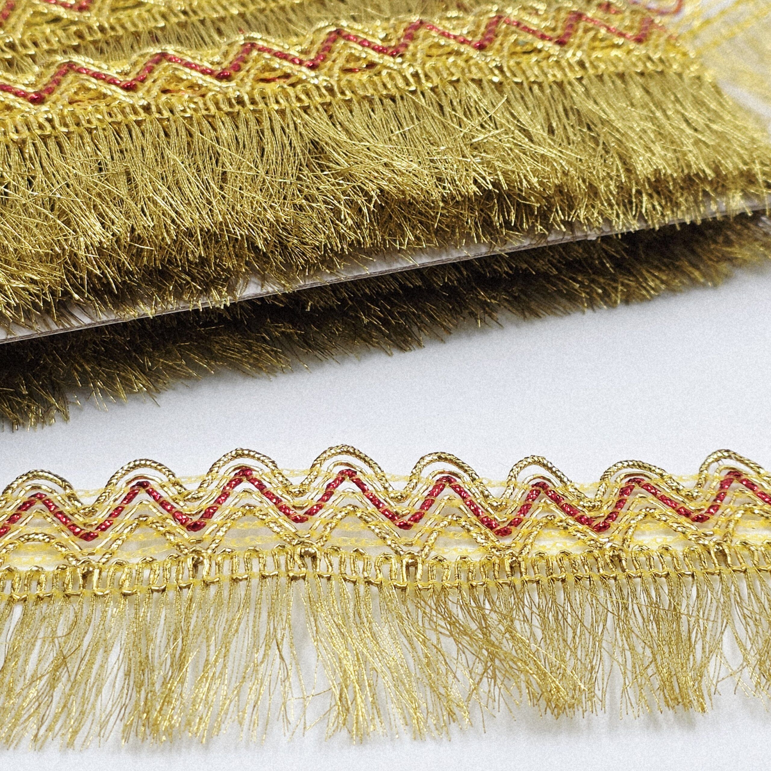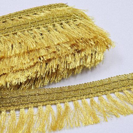 PASAMANERIA GOLD/FUCSIA 4.5 CM DE ANCHO CON FLECOS. X 10 YARDAS.